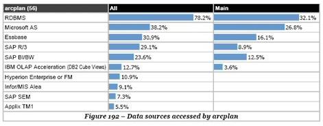 BI Survey 7: arcplan 名列榜首AMTeam.org消息:BI Survey(又称OLAP Survey) 2008年度再次将arcplan誉为商业绩效管理(BPM)解决方案的最佳提供商,尤其是对于拥有SAP, Oracle/ Hyperion 以及 Applix back-ends(后端)环境的各类用户。 arcplan 同时还从30多种BI产品中脱颖而出,成为用户实现项目目标最佳BI工具以及成功BI解决方案的最佳提供商 比任何一种前端产品更具有多数据源的接入性 由在商业智能和企业绩效管理领域最具权威的、独立的商业应用研究中心(BARC)发布的BI Survey 7 (www.BI-Survey.com)报告,再次将arcplan誉为在SAP BW与Applix TM1环境中应用最为广泛的第三方BI前端工具;排名第二的为Hyperion Essbase,以及排在第五位的Microsoft Analysis Services (AS)。报告中还着重提到arcplan的用户具有“非常广泛”的数据源接入性。 根据研究,图 192显示了包括关系型数据库,Microsoft AS,Essbase,SAP R/3,以及SAP BW 与BI, IBM OLAP Acceleration, Hyperion Enterprise and FM, 还有 Infor/MIS Alea在内的多种数据库/源。研究发现,arcplan的用户相对任何其他的BI产品的使用者而言能够连接都最多的数据源(见下图198)。这正体现出arcplan的创新的以企业绩效管理(BPM)为驱动的分析,快速而简洁地将来自于任何数据源的知识附加在用户的指尖。