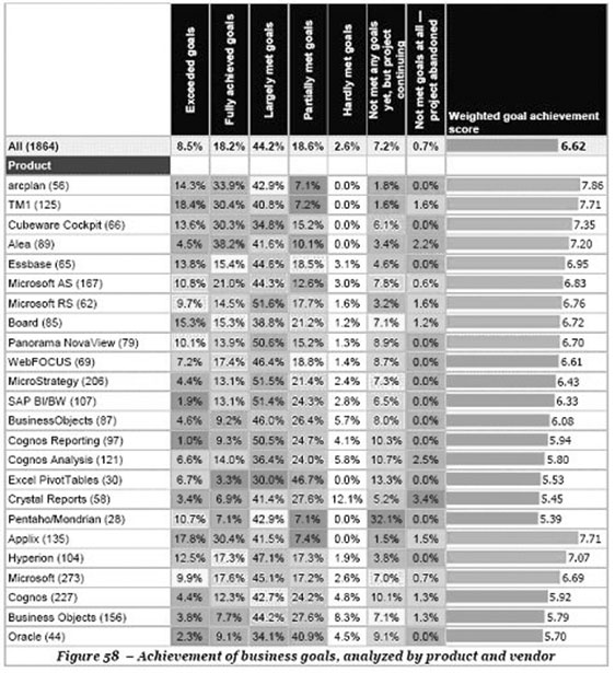 arcplan前端为企业绩效管理提供所需能力 “我们在BI Survey中的排名是对我们为SAP用户以及众多其他BI系统提供高附加值的企业绩效管理策略的认同,”Guenter H. Krauss,arcplan CEO。“在多久以前,arcplan就成为排名第一的第三方BI前端展示工具并通过了SAP的官方认证。长久以来,我们与SAP的用户紧密合作,并且深知他们的业务需求。他们,这如其他用户一样,需要一个绩效管理应用前端平台,将他们所有的数据源整合起来,使得部门经理或管理人员可以看到绩效的整个情况,并且通过下钻获取更多信息。” 客户业务目标的实现: arcplan排名第一 当受访者被问及到,哪个产品在他们的项目实施中达到了他们的目标时,arcplan被用户排在了第一位。(见下图58)。 经统计,超过33%的IT项目以失败告终。与此形成鲜明对比的是,arcplan的用户却极为成功。另外,同样使arcplan感到荣幸的是,在BI Survey报告中的企业利益指标Business Benefits Index (BBI)中,arcplan在所有产品中排名第四。这一指标包括了诸如节省成本、效率以及其他改进在内的9种企业利益。