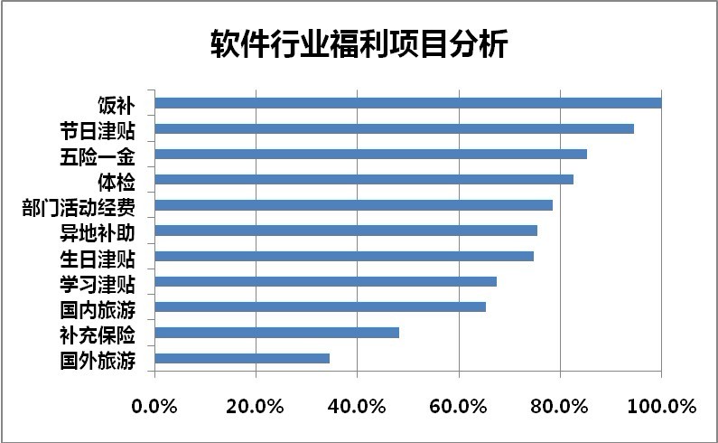 从全行业来讲,软件行业本科毕业生起薪在3750元,处于市场中位以上,但作为其主要竞争对手的互联网行业,却以高出30-40%的起薪价格招揽人才。虽然一些大型互联网公司取消了今年的招聘计划,但从整个行业来讲,互联网行业的技术研发人员的毕业生起薪处于市场高位。 三、软件行业福利优势明显
