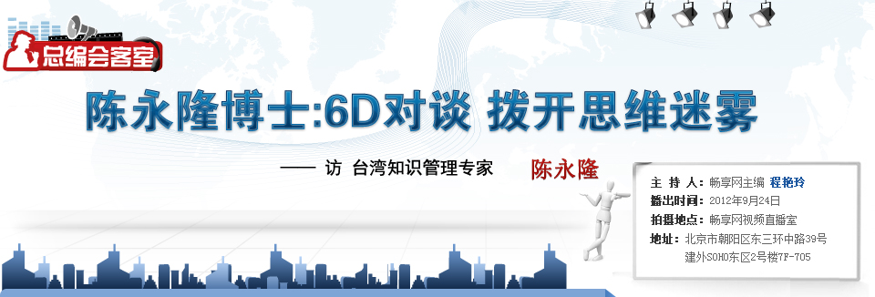 嘉宾:社交网络是很神奇的时代,跨过台湾海峡,可以让我通过文字,把思想的磁场散发出去。这几年在知识管理、在IT建设方面,我确实投入很多时间,然后有很多机会就像今天来畅享网的时候,楼下有很多让我们喝下午茶,悠闲的咖啡屋,就像在台北有些时候我也会到高科技园区旁边喝下午茶,后来我发现我不太再去高科技园区喝下午茶了,因为我发现这些高科技的人士他们虽然非常的顶尖,他们的视野跟他们的前瞻性都胜过我们一般的上班族。他们都在研发如何让我们很有效率的工具,但是我慢慢发现,他们过的有点苦闷,他们甚至在喝咖啡的下午茶的时间,明明可以很轻松的聊工作、聊家庭,但是我发现他们总是抱怨东抱怨西。我发现他们的怨恨怎么会那么多,慢慢也发现我在大学教书的环境附近,看到很多教授知识学历都很高,已经到了博士当了老师,为什么常常骂下一代80、90后的,你们这些学生不长进,你们这些学生怎么教都教不会。我有时候在想,学生就是不懂才会坐在底下让你教,你教不会就要修正你的教法,你怎么还在骂他们,所以我们会发现一件事,就是高科技的人你在研发有效率的事,可是你没有让自己有效率,知识分子有更多的知识以后你并没有让自己更谦虚,所以我开始想要把思想的宽度、高度、深度这样的事情慢慢的写在我的微博上边。