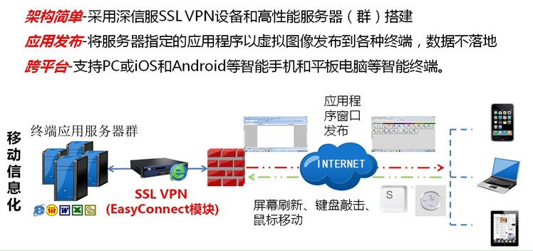 深信服跨平台远程应用发布解决方案深信服EasyConnect(远程应用发布)解决方案,通过在企业部署终端应用服务器和Easyconnect设备,将应用程序实时运行的图像,通过安全传输隧道,虚拟的展现在IOS、Android、WindowS各类终端上。 深信服EasyConnect(远程应用发布)解决方案,通过在企业部署终端应用服务器和Easyconnect设备,将应用程序实时运行的图像,通过安全传输隧道,虚拟的展现在IOS、Android、WindowS各类终端上。 目前的移动办公和移动网络技术已经突破时间和地点的束缚,帮助员工实现基本的移动办公,帮助企业提高生产效率。如何让企业应用能够跨IOS、Android、Windows三大平台,安全的运行在任何设备上?正考验着企业信息部门。 虽然众多IT厂商提供IOS和Android终端解决方案,但还是必须面对以下问题: 1、 迁移成本问题:一旦需要在IOS、Android、windows终端同时部署业务,就必须针对原有Windows应用系统的进行改造,相关客户端也需要重新开发。 2、维护成本问题:信息部门须考虑如何面对IOS、Android、Windows三大操作系统每年一到两次的重大更新升级,和层出不穷的硬件平台。 3、功能的缺失:由于智能终端性能架构和性能问题,无论是B/S还是C/S模式的应用,原有的功能都无法全部迁移到智能终端。 4、 安全风险:因移动终端的便携性,终端往往被随身携带,一旦设备遗失,企业核心数据就可能存在各种泄密,给企业带了极大的经济损失。 深信服EasyConnect(远程应用发布)解决方案 深信服EasyConnect(远程应用发布)解决方案,通过在企业部署终端应用服务器和EasyConnect设备,将应用程序实时运行的图像,通过安全传输隧道,虚拟展现在IOS、Android、Windows各类终端上。同时,将用户操作,如文字输入、鼠标点击、手势等传输到远端终端应用服务器上,实现对应用程序的操作控制。在方案部署中,无需对现网结构、应用程序做出任何改造,也不需要开发任何业务系统的APP客户端,即可轻松实现跨平台访问。