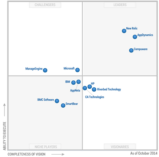 Gartner 2014应用性能监控(APM)魔力象限出炉Gartner公布了2014年应用性能监控魔力象限报告,Gartner分析师在报告中指出,ManageEngine Applications Manager在支持APM的五大功能维度的同时,能够更好地支持.NET和Ruby应用以及VMware、Azure虚拟化设施监控。 2014年10月28日,全球领先的信息技术研究与咨询公司 Gartner公布了2014年应用性能监控魔力象限报告(Magic Quadrant for Application Performance Monitoring),根据不同厂商的执行能力和发展前景的完备性对全球12家主流的应用性能监控产品供应商进行了评估。基于Gartner的独立分析,厂商被划分为领导者(Leader)、挑战者(Challengers)、特定领域者(NichePlayers)和远见卓识者(Visionaries)四个象限。
