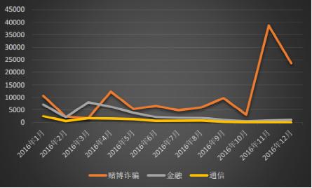 【安卓平台APK处理数量走势】 受几起重大网络欺诈案件的影响,网络欺诈在2016年受到了前所未有的社会关注。2016 年亚信安全反钓鱼系统共监测到网络欺诈钓鱼网站共 217,072 个,其中金融钓鱼网站及通信类钓鱼网站在本年度呈持续递减趋势,这与我们国家 2016 年出台的多项网络安全政策密不可分,但赌博诈骗类的网络欺诈事件却有了爆发式增长,这显示网络诈骗的治理之路仍然任重而道远。