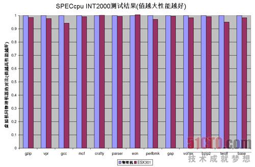 当然,资源的有效调度也是性能的重要指标,通过如下的Reservation(保留值)、Limit(最大值)和Shares(份额)的管理,很好的调度了系统的关键资源,确保了系统资源的高效利用。可以只分配最基础的资源,通过Shares来引入虚拟机的优先级和资源竞争机制,一旦多台虚拟机同时争用某一资源,根据他们的Shares来进行分配,确保高优先级的虚拟机最先获得这些资源。同时又能保证这些资源空闲的时候,其他虚拟机也可以使用。 另外,虚拟化的性能也可以从虚拟环境和物理环境的比较来决定虚拟化的对资源的占用情况。下面是在香港的某一用户现场,对VMware ESX 3.01和物理机性能进行对比的测试结果,采用的测试工具是SPECcpu INT2000。你可以看到虚拟化对服务器的性能影响很小,影响基本都小于6-7%,对不同的应用影响略有差异。