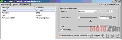 对于这种架构,虚拟化层的稳定性相当关键,因此为了达到可靠性的要求,虚拟化层往往是专门设计的虚拟化内核而不是通用的操作系统,从而可以提高可靠性。当然,对于可靠性和扩展性的最好的验证不是理论,而是用户的实际应用。如下图所示的就是用户使用VMware ESX Server的实际数据,通过虚拟化层的增强,确保了PC服务器运行超过950天而没有任何停机现象。 而大量用户案例也验证了VMware ESX Server卓越的扩展能力,很多国内外的用户已经在4路CPU的PC服务器上成功部署并可靠运行了30多个虚拟机。而管理工具VMware VirtualCenter更是在各数据中心的复杂环境中表现出众,已经可以轻松管理数千台虚拟机,成为虚拟化管理中心,是数据中心虚拟化环境管理的不二选择。 4. 数据中心虚拟化对性能也提出了很高的要求 性能是数据中心追求的一个重要指标,因此虚拟化对性能的消耗也是考察的一个要素。一款优秀的虚拟化产品本身要能尽可能少占资源,可以让更多的资源来运行用户的应用。同时也要很好的调度不同虚拟机之间的资源,来确保运行在虚拟化平台上的所有的应用都高速可靠运行。为了达到这一要求,虚拟化产品要实现对CPU和内存等资源精密控制,比如CPU要控制到MHz、内存控制到MB,确保服务器里的资源最大限度利用,同时,尽可能简化虚拟化层所带来的负载。当然CPU的一些特性也要能很好的支持,如:多线程、多核、虚拟化等。如下图所示,是在VMware ESX Server上对一台运行IBM Notes的虚拟机进行配置,其中的CPU多线程、MHz的配置都简单方便,最大限度利用了CPU资源,从而达到了最优化的性能。