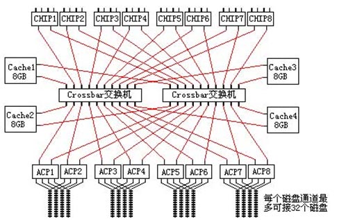 NAS实例介绍(二)举例2:HDS 公司的Lightning9960 存储系统分析: Lightning9960 的体系结构如图一所示,主机接口最大可以使用四个CHIP 对,每个CHIP 对由两个可以互相备份(每个主机必须通过两个光纤通道适配器同时与两个CHIP 的一个口连接)的CHIP 组成,每个CHIP 拥有四个光纤通道(ESCON 接口在本文中将不涉及,但并不影响存储工程师对性能的讨论)主机接口和两个用于与内部两个交换机连接的光纤通道接口,四个CHIP 对共有32 个光纤通道主机接口和16 个光纤通道的与内部交换机相连接的接口。在Lightning9960 的中间采用两个Crossbar 交换机,每个交换机都与每个CHIP、每个缓存块和每个磁盘阵列控制器的光纤通道相连接。Lightning9960 最多有四块8GB 的缓存,缓存是CHIP 与控制器之间数据的必经缓冲区,它与交换机之间共有16 个光纤通道连接(图中只画出了8 个)。在体系结构的最下面是四对磁盘阵列控制器,每对控制器有四个连接交换机的通道和8 个用于连接磁盘驱动器的磁盘通道。控制器对中的不同控制器的两个磁盘通道同时连接到双端口磁盘的两个端口上提供备份连接,所以每对控制器实际有4 个独立的磁盘通道。 z Lightning9960 的数据通道带宽: 从Lightning9960 的结构图中可以计算出每部分的带宽是:32 个光纤通道主机端口总带宽为3200MB/ 秒;CHIP 与交换机之间的总带宽为1600MB/ 秒;在交换机到缓存之间的总带宽为1600MB/ 秒;在缓存到交换机之间的总带宽为1600MB/ 秒(缓存和交换机之间是双向传输所以此项带宽与上一项带宽互相不影响);交换机到磁盘阵列控制器的总带宽为1600MB/ 秒;内部磁盘通道的总带宽为1200MB/ 秒(因为每对磁盘阵列控制器的四个磁盘通道中在做RAID5 时有一个通道的带宽被用来做校验)。由于所有以上的带宽都是串行结构,所以Lightning9960 的数据通道实际总带宽受到链路中最小值1200MB/ 秒的限制。但数据通道带宽并不等于整个系统的实际性能,实际的性能将受到每个磁盘阵列控制器(ACP)的RAID 引擎、系统整个体系结构和应用环境的影响,下面将讨论在应用中的实际性能。 z Lightning9960 的体系结构: