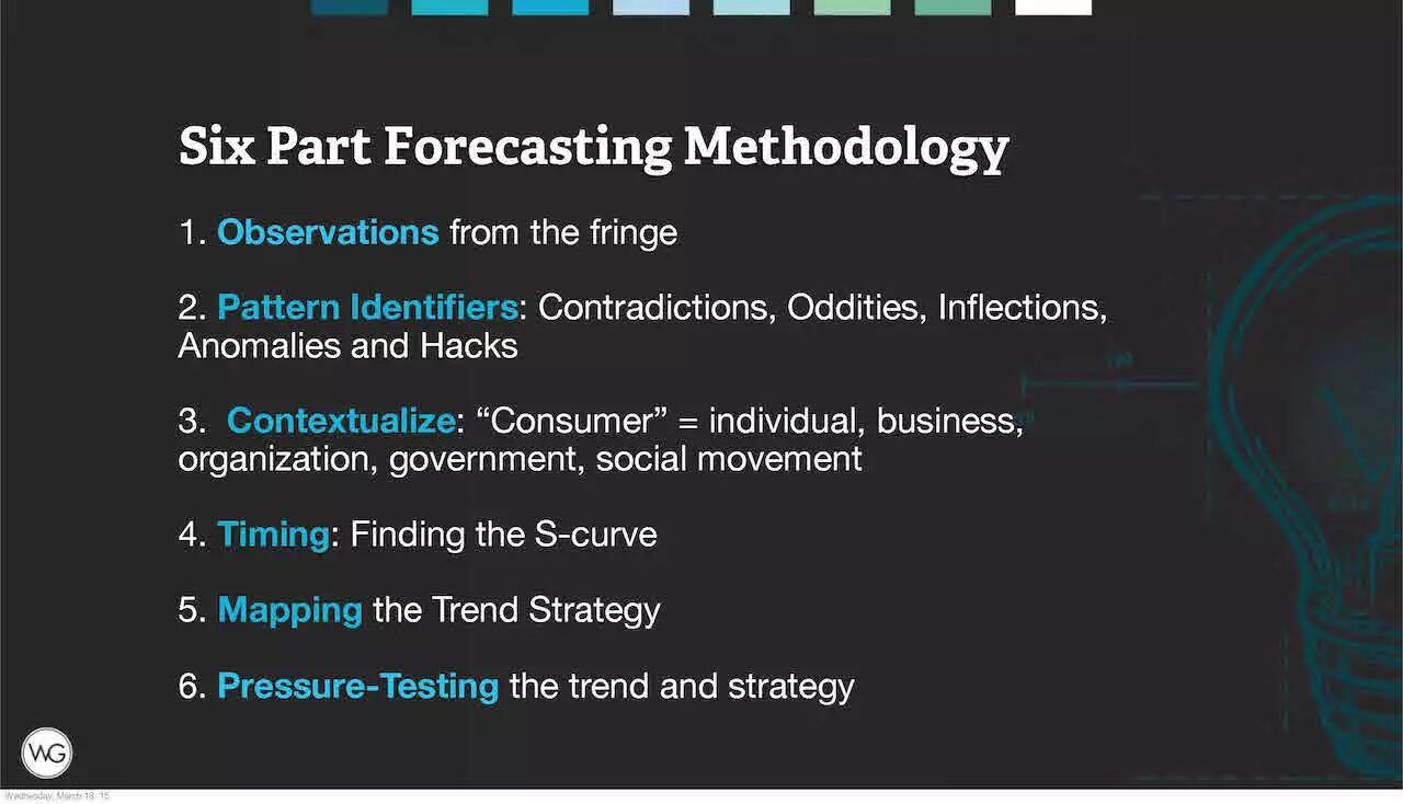 趋势从何而来?预测趋势方法论,要考虑六个部分:1、前沿观察,2、模式识别,3、脉络,4、时机,5、映射趋势策略,6、压力测试 。
