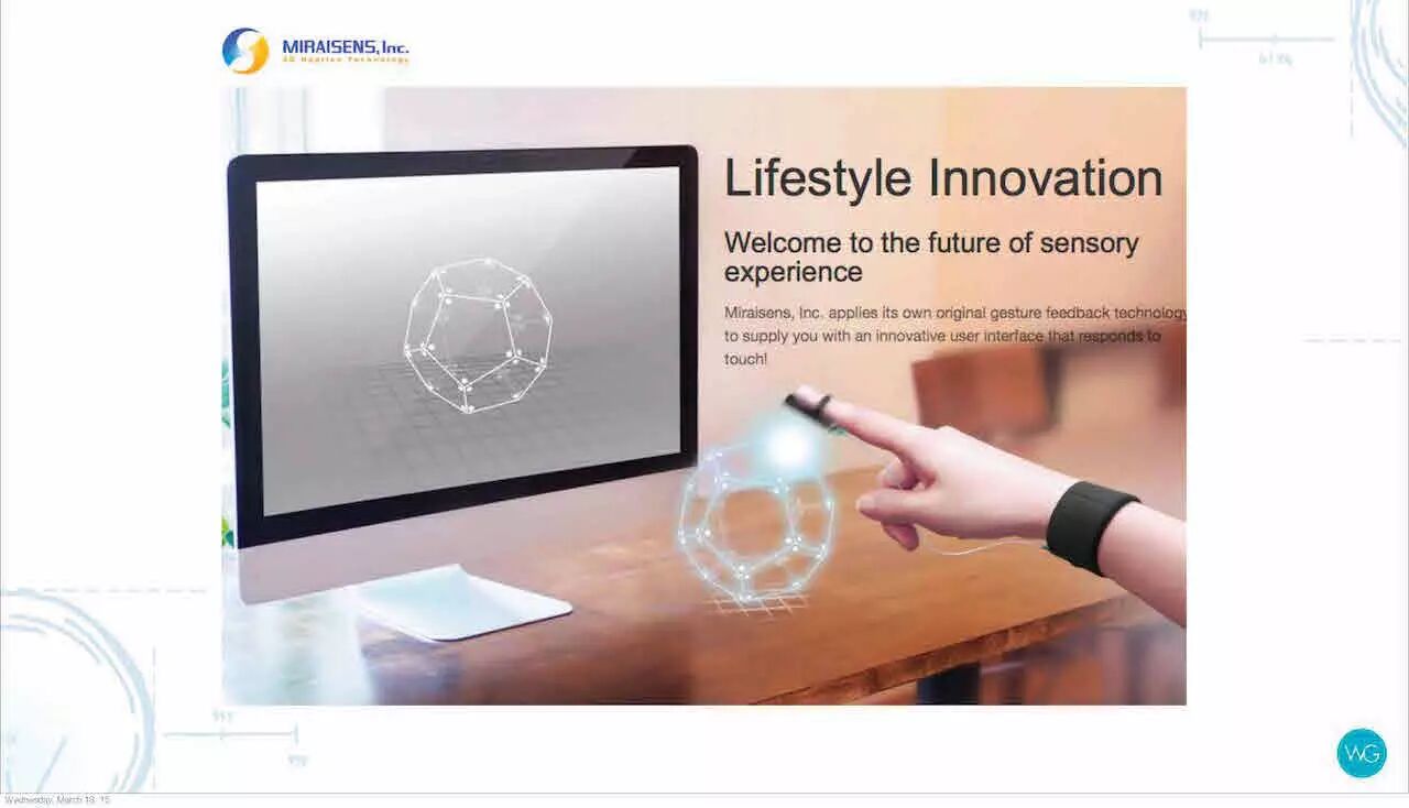 Miraisens公司开发的3D影像技术可以让人“触碰”虚拟物体,通过震动模拟现实世界的触感,从而令使用者真实感触虚拟世界的物体。
