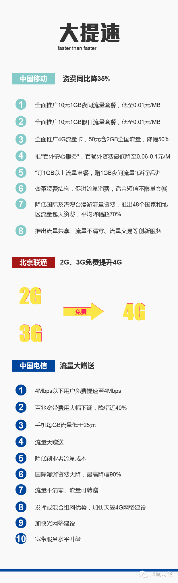 下午,三大运营商迅速响应:北京联通率先宣布网络提速降费方案,宽带用户全部免费提升一倍,原2G、3G移动用户全部提升至4G,保持原资费不变。方案实施后,百兆光纤包月不到200元,本地流量半年包10元1.5GB。预计此次提速6月底前完成。中国电信推出提速降费十大举措,提出:宽带免费提速,每Mbps价格降幅近4成;手机流量降价,每GB低于25元等举措;中移动推出十二大“提速降费”举措资费同比下降35%。