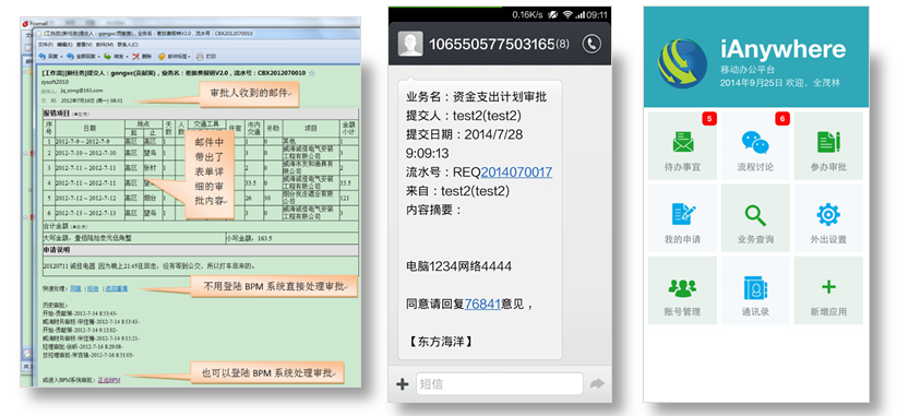 费用报销网络化:系统通过IE浏览器访问,能上网就能填单及审批,审批任务实时发送给审批人,保证审批人及时收到审批任务,系统发送任务邮件或短信,提醒审批人尽快审批,审批人通过回复邮件或者短信,即可完成审批。