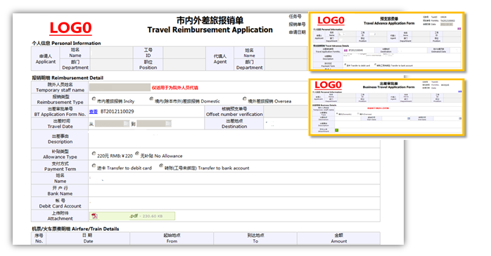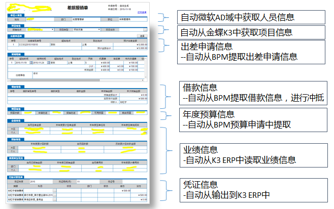 报销单据电子化:主要包括三大类信息:部门、人员等基础信息;预算项目、费用科目及金额等预算信息;用于审批、分析等所需的关键业务信息。单据由纸质单据变为电子单据,自动生成单据编号和条码;实现基础信息自动带出(申请人、所属网络、办事处、大区、申请日期、收款人银行、收款人账号等);合计金额自动计算、大写金额自动生成;字段可以设置自主填写或下拉选择,可以定义各个字段的数据格式;字段可以设置是否必填,并做必填的提醒和校验;可以对未完成核销的借款自动进行提醒;单据允许上传附件,并可以定义允许上传附件的大小。