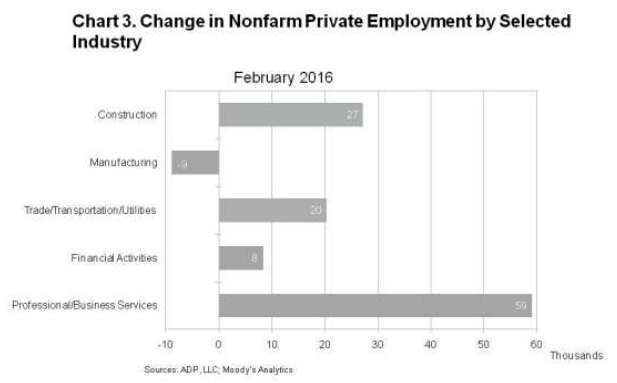注:由于部分数据做了四舍五入处理,所以数据的总和可能不等于总数 2月,雇员人数少于49人的小型企业增加了76,000个工作岗位,和1月向下修正的数字75,000基本保持一致。企业规模在50-499名雇员的中型企业增加62,000个工作岗位,相对于1月的74,000个工作岗位有所减少。规模在500或以上雇员的大型企业就业人数有76,000个工作岗位,相对1月数据44,000有显著增加。规模在500—999名雇员的企业,增加了15,000个工作岗位。雇员超过1000名员工的公司新增62,000个工作岗位。 商品生产领域在2月就业人数增加5,000个就业岗位,只相当于1月份向上修正数字19,000的四分之一。建筑业2月增加了27,000就业岗位,比1月份的上修数字26,000略有增加。与此同时,制造业减少9,000个就业机会,这也是近五年来的第二大跌幅。 服务领域提供的就业岗位在2月增加了208,000个工作岗位,相比1月的下修数字174,000有显著增长。《ADP全美就业报告》显示:专业、商业服务行业在2月增加了59,000个工作岗位,相对1月份的下修数字38,000有强劲增长。贸易、运输和公用事业2月增加了20,000个工作岗位,相对于上月的下修数字26,000有所减少。金融服务业增加了8,000个工作岗位,这是自2015年8月以来最低增幅。 “在2月,尽管经济持续低迷,如国际市场动荡和美元走强都影响到了大型企业的利润,但是大型企业的就业出乎意料地实现了强劲增长。 ADP研究机构负责人兼副总裁Ahu Yildirmaz表示,“而在大型企业的这一波就业增长中,大部分来自服务领域。” Moody ' s Analytics的首席经济学家马克·赞迪(Mark Zandi)表示, “尽管全球金融市场动荡,美国就业机器仍然保持高速运转。能源和制造业在就业市场上仍稍显乏力,但瑕不掩瑜,整个就业市场呈强劲发展势头,美国经济正在快速接近充分就业。” 图表1:全美非农私营企业就业的月变化