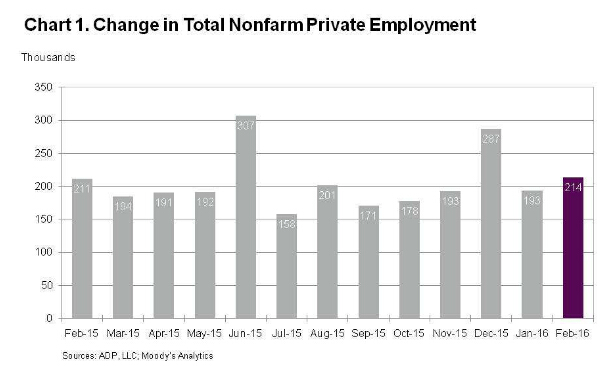 ADP全美就业报告:2月私营企业就业人数增21.4万ADP发布了2016年2月《全美就业报告》,报告显示,从2016年1月到2月,美国私营企业就业人数增加21.4万。《ADP全美就业报告》由国际领先的人力资本管理解决方案供应商ADP与穆迪分析公司联合制作完成。报告来自ADP的实际支付薪酬数据,是在季节性调整的基础上,反映美国非农私企每月总的就业人数变化情况。 ADP发布了2016年2月《全美就业报告》,报告显示,从2016年1月到2月,美国私营企业就业人数增加21.4万。《ADP全美就业报告》由国际领先的人力资本管理(HCM)解决方案供应商ADP与穆迪分析公司(Moody’s Analytics)联合制作完成。报告来自ADP的实际支付薪酬数据,是在季节性调整的基础上,反映美国非农私企每月总的就业人数变化情况。 2016年2月就业报告摘要