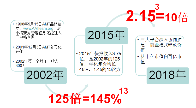 AMT共同创始人王玉荣:众包与产业云推动企业指数级增长什么是指数型组织?指数型组织(Exponential Organization,ExO)是指在运用了高速发展的技术的新型组织方法的帮助下,让影响力(或产出)相比同行发生不成比例的大幅增长的组织(至少10倍)。 本文关键字: 企业指数 前言 什么是指数型组织?指数型组织(Exponential Organization,ExO)是指在运用了高速发展的技术的新型组织方法的帮助下,让影响力(或产出)相比同行发生不成比例的大幅增长的组织(至少10倍)。不同于使用人海战术或大型实体工厂的传统组织,指数型组织的建立根基是信息技术,将原本的实体去物质化,转变成需求最大的数字世界中的东西。(摘自《指数型组织》,作者奇点大学创始执行理事、奇点大学全球大使萨利姆·伊斯梅尔) 如何实现指数级增长?AMT共同创始人王玉荣在AMT2016年度战略发布会上为我们详解了企业实现指数级增长的要点,我们选摘其精华观点与读者分享。 AMT从2002年第一财年开始,到2015年实现收入3.75亿(即125倍的增长,13年中平均年化增长率45%),我们是一家历史上已经完成指数级增长的企业。而在未来我们多个业务增长点的并发,从现在十亿量级到百亿市值努力,仍然是一个指数级增长的过程(见图1)。