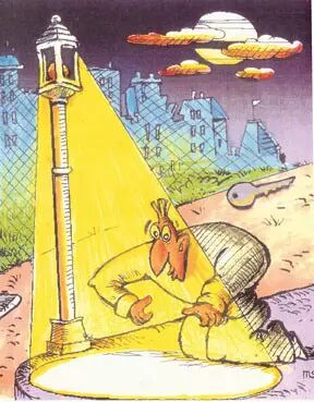 一天晚上,一个醉汉在路灯下不停地转来转去,警察就问他在找什么。醉汉说,我的钥匙丢了。于是,警察帮他一起找,结果路灯周围找了几遍都没找到。于是警察就问,你确信你的钥匙是丢到这儿吗?醉汉说,不确信啊,我压根就不知道我的钥匙丢到哪儿。警察怒从心中来,问,那你到这里来找什么?醉汉振振有辞:因为只有这里有光线啊!