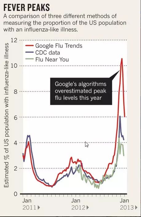 对GFT预测更猛烈的攻击,来自著名期刊《科学》【13】。2014年3月,该杂志发表由哈佛大学、美国东北大学的几位学者联合撰写的论文“谷歌流感的寓言:大数据分析中的陷阱(The parable of Google Flu: traps in big data analysis)”,他们对谷歌疫情预测不准的问题做了更为深入地调查,也讨论了大数据的“陷阱”本质。《科学》一文作者认为:大数据的分析是很复杂的,但由于大数据的收集过程,很难保证有像传统“小数据”那样缜密,难免会出现失准的情况,作者以谷歌流感趋势失准为例,指出“大数据傲慢(Big Data Hubris)”是问题的根源。