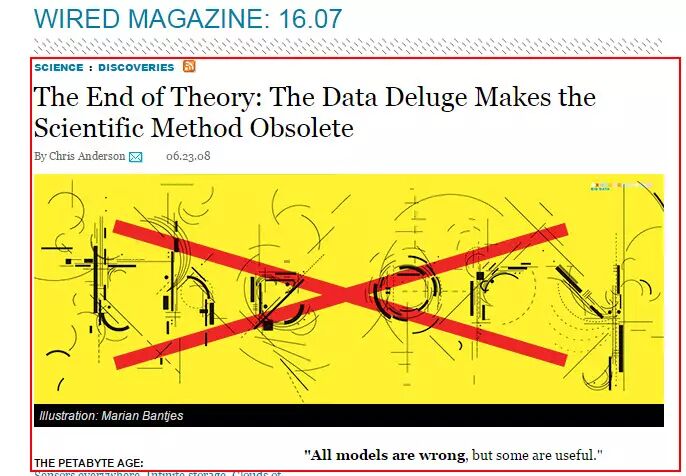 “要相关,不要因果”,这个观点其实并非舍恩伯格首先提出的。最早的提出者应为《连线》(Wired)主编Chris Anderson ,2008年他在题为 “理论的终结:数据洪流让科学方法依然过时(End of Theory: the Data Deluge Makes the Scientific Method Obsolete)【9】” 文章中,率先提出:在PB时代,我们可以说,有相关性足够了(Petabytes allow us to say: "Correlation is enough)"。