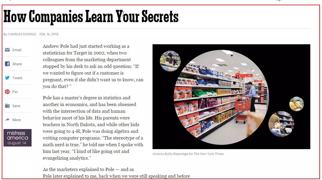 2012年2月16日,《纽约时报》刊登了Charles Duhigg撰写的一篇题为《这些公司是如何知道您的秘密的》(How Companies Learn Your Secrets)的报道【15】。文中介绍了这样一个故事: